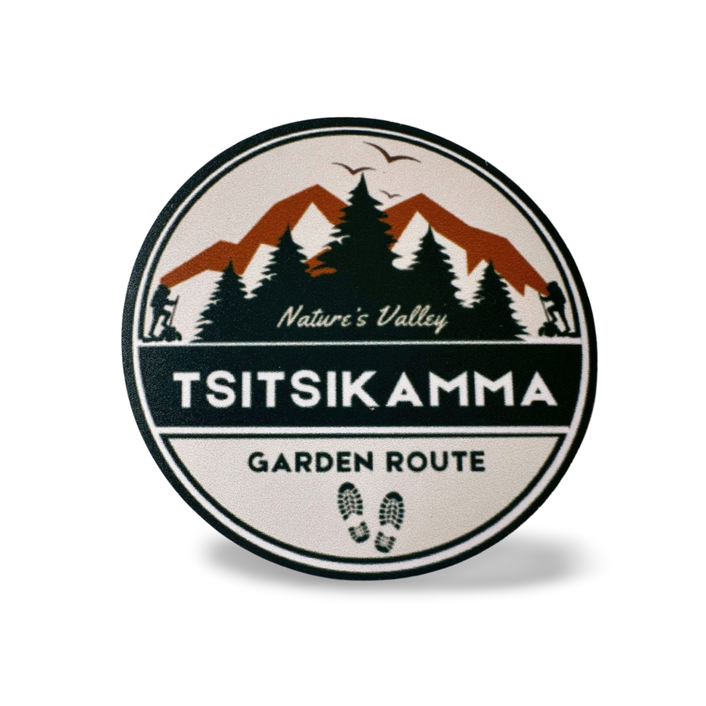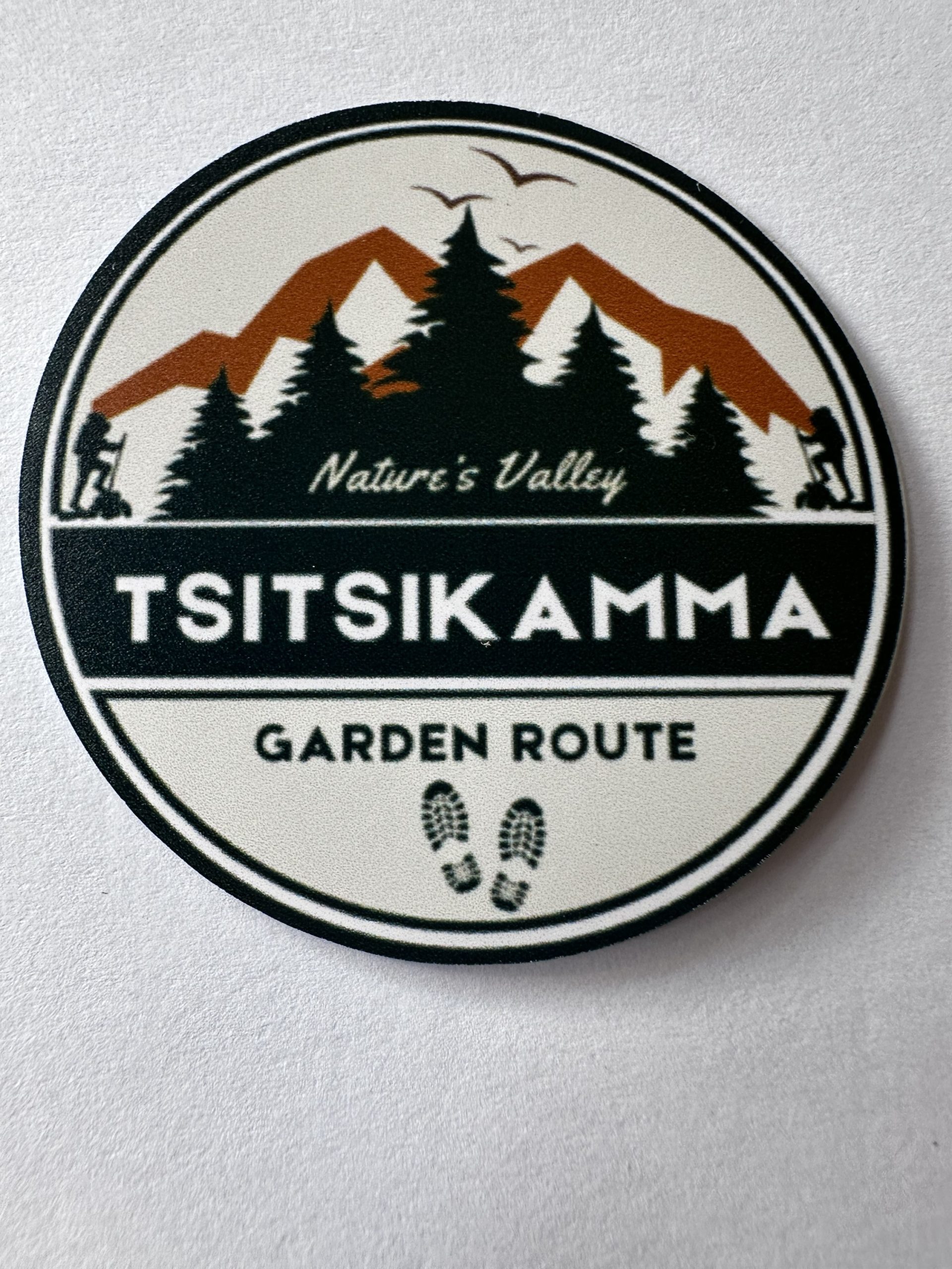 A round fridge magnet, 50mm in diameter depicting the Tsitsikamma trail