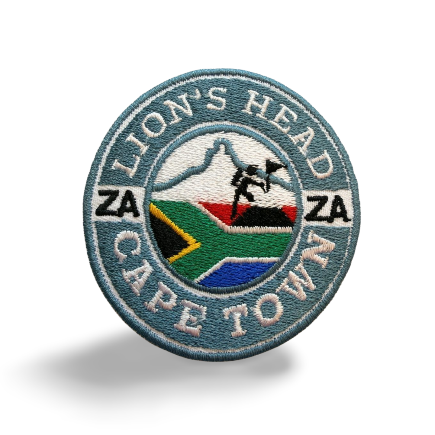 An iron-on 6,5cm diameter round badge for the Lion’s Head peak trail in Cape Town to commemorate your trek.