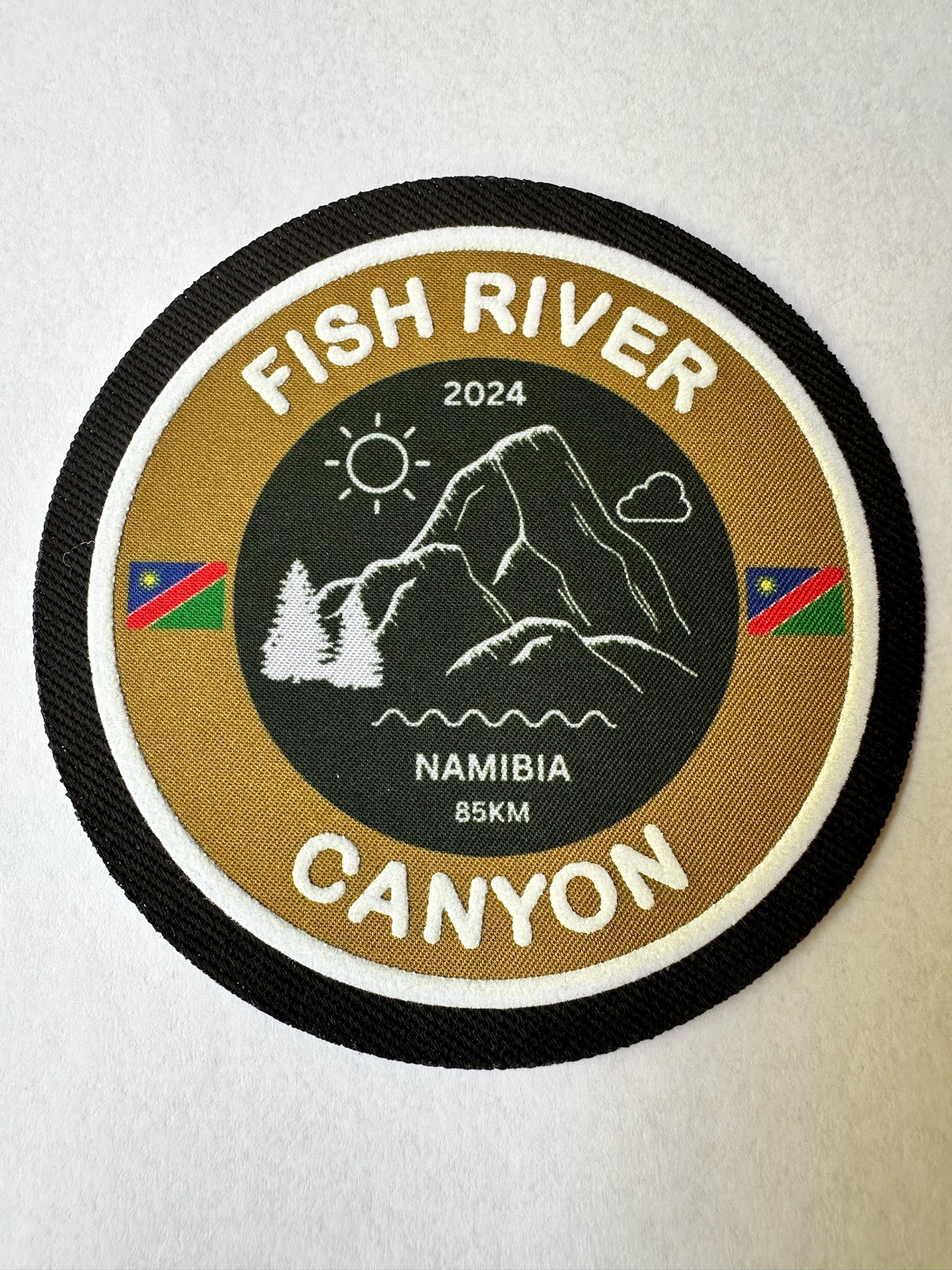 High Quality durable silk print trail badge – round, roughly 7cm in diameter.