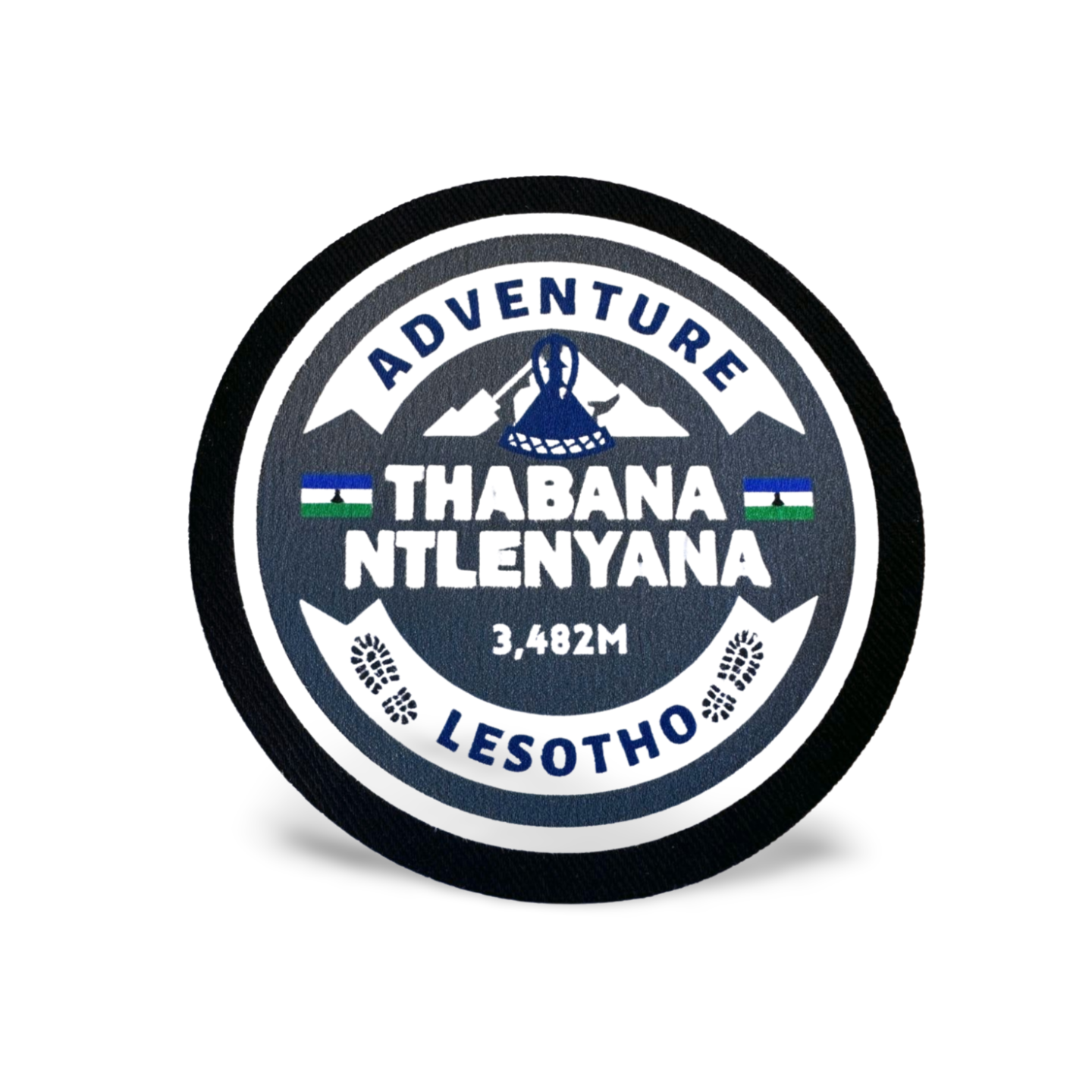 A silk print badge, roughly 7cm in diameter depicting the Thabana Ntlenyana trail of Lesotho.