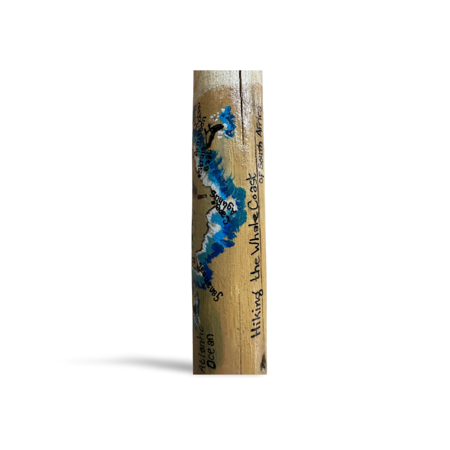 Unique, 1,2m hand-painted trekking pole, with leather hand straps, depicting the trails around South Arica, to help you tell your hiking story.